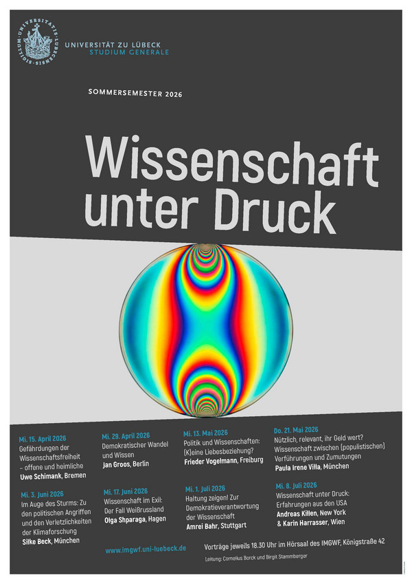 Die Vorlesungsreihe „Wissenschaft unter Druck“ im Studium Generale im Sommersemester 2026 will aktuelle Gefahren für Wissenschaft in den Blick nehmen. Die Vorträge fragen nach den gegenwärtigen Bedingungen des Funktionierens von Wissenschaft in demokratischen Gesellschaften und will Potenziale ihrer Resilienz freilegen.